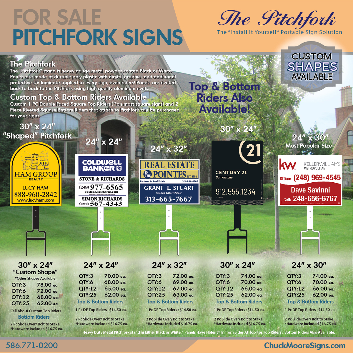 Chuck invented this type of sign decades ago. Pitchfork signs offer a long lasting and versatile way to identify your property or listing. Great custom shapes available or create made of polyethylene panels with digital graphics and a UV protective coating. Bolted to a heavy duty black or white pitchfork stake. One of our top selling signs. A great way to implement shaped sign panels as well and has the ability to transport and install your own signs! No more waiting for that installer for those residential sign installs or removals.